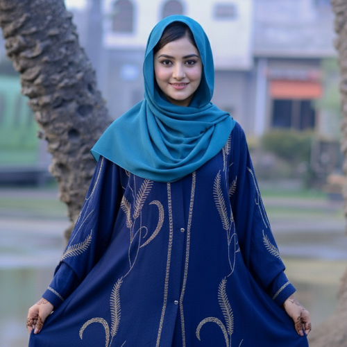 Royal Azure Dual-Layer Abaya with Medallion Accent